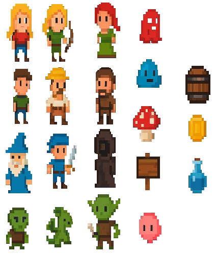 A charming collection of pixel art characters and items perfect for game developers. This pack includes a variety of unique characters such as archers, wizards, farmers, goblins, and more, each designed in a colorful, retro-inspired style. Along with the characters, you'll find essential game items like mushrooms, barrels, potions, and wooden signs to enrich your game world.